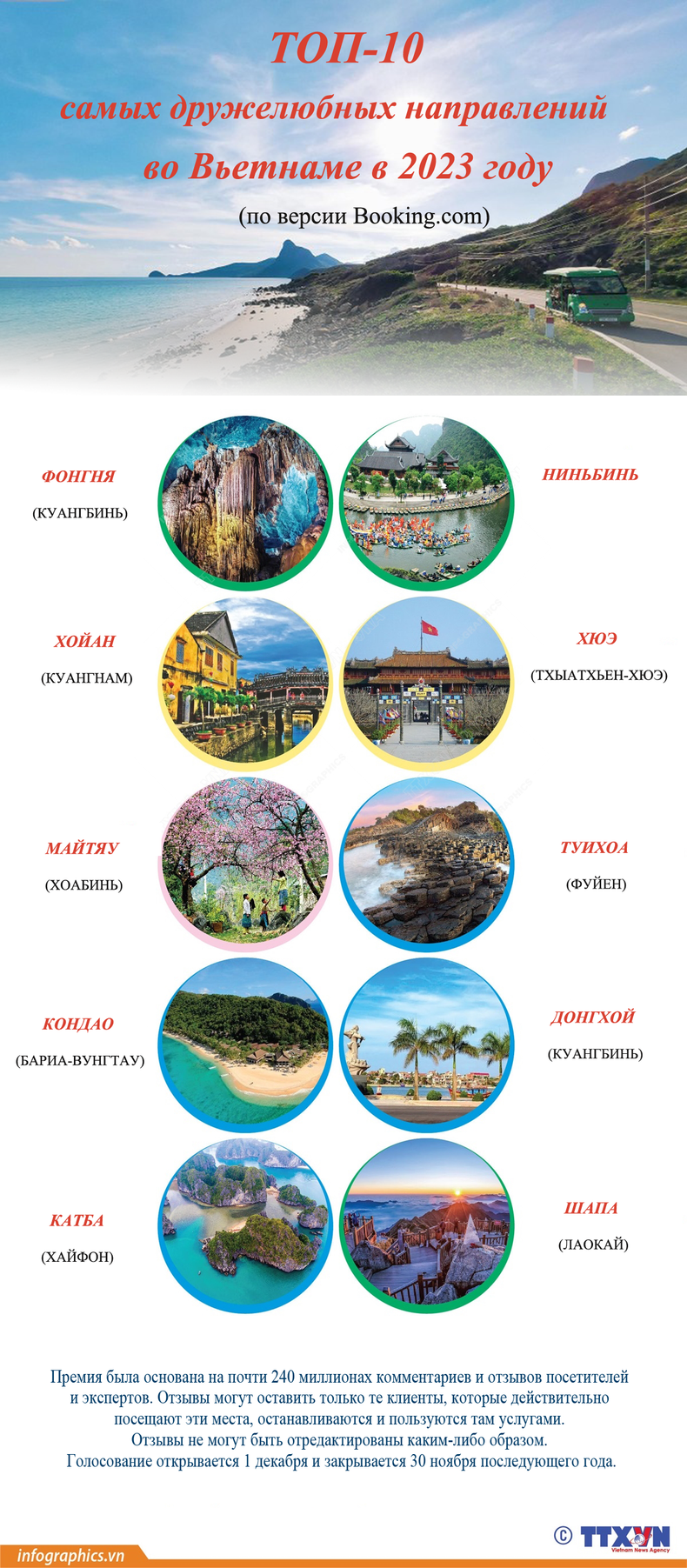 Traveller Review Award 2023 года объявляет дружелюбные направления во Вьетнаме для того, чтобы помочь путешественникам получить наилучшие впечатления об их уровне гостеприимства и дружелюбия, что приносит им незабываемые путешествия.