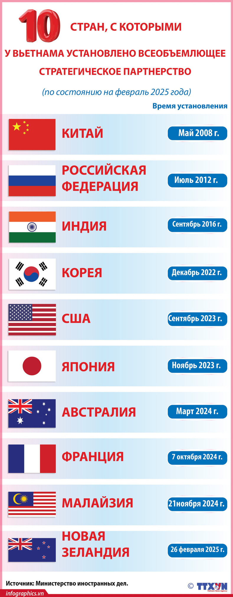 По данным Министерства иностранных дел, по состоянию на февраль 2025 года Вьетнам установил отношения всеобъемлющего стратегического партнерства с 10 странами.