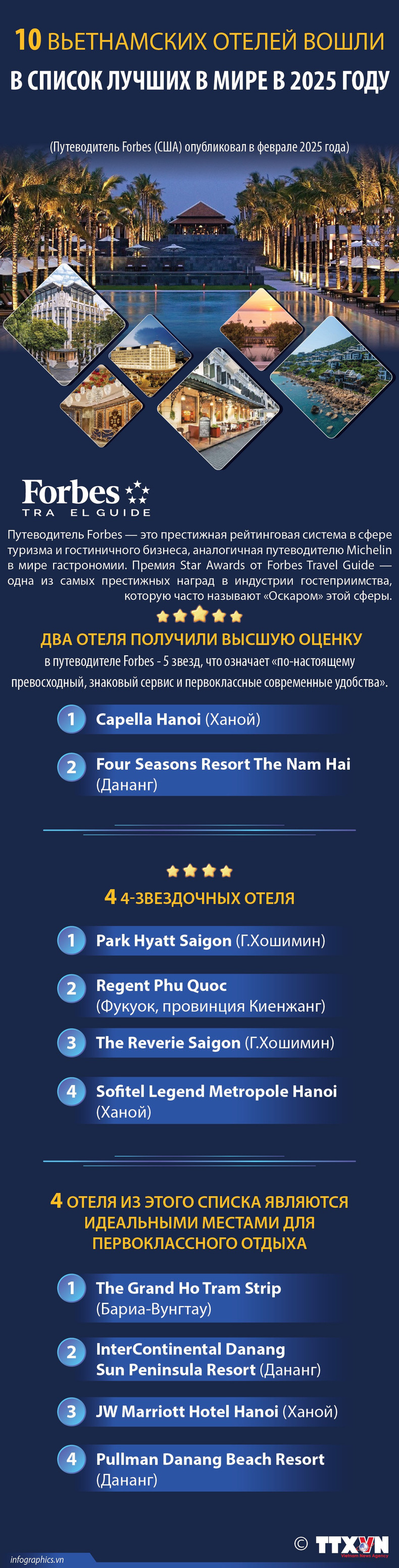 Список лучших отелей мира 2025 года был объявлен путеводителем Forbes на церемонии награждения Star Awards в феврале 2025 года. Вьетнам представлен в рейтинге 10 отелями, среди которых 2 5-звездочных отеля, 4 4-звездочных отеля и 4-звездочные гостиницы, включенные в список, являются идеальными направлениями для первоклассного отдыха.