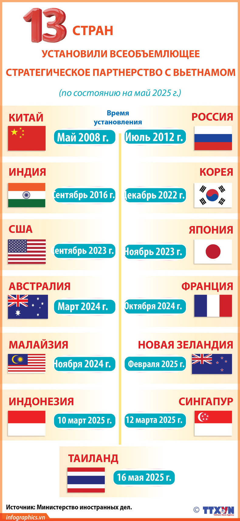 всеобъемлющее стратегическое партнёрство Вьетнам - Китай Вьетнам - Россия Вьетнам - Индия Вьетнам - Южная Корея Вьетнам - США Вьетнам - Япония Вьетнам - Австралия Вьетнам - Франция Вьетнам - Малайзия Вьетнам - Новая Зеландия Вьетнам - Индонезия Вьетнам - Сингапур Вьетнам - Таиланд