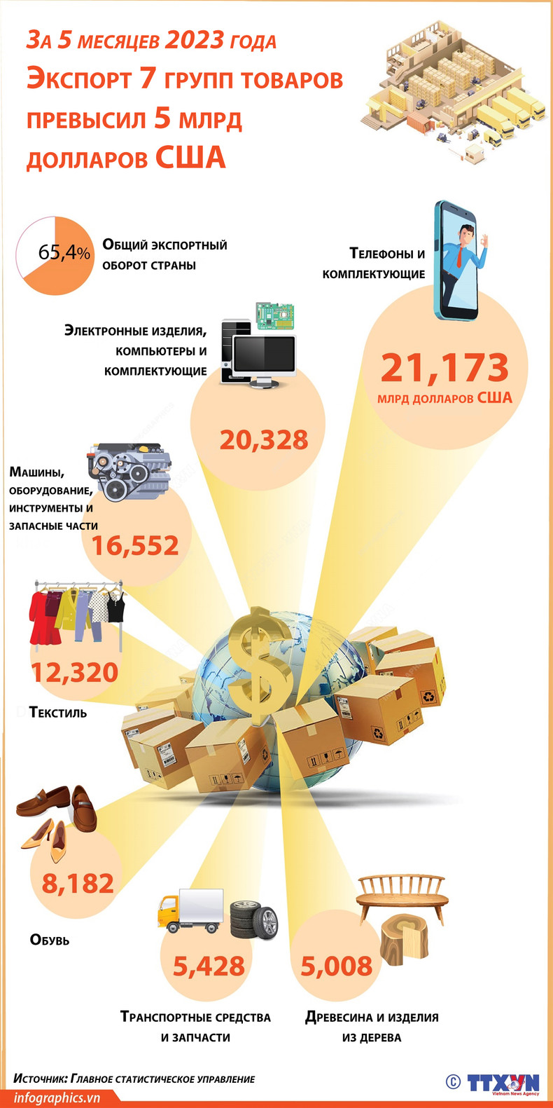 За первые 5 месяцев 2023 года есть 7 групп товаров, экспорт которых превысил 5 млрд долларов США каждый, что составляет 65,4% от общего экспортного оборота страны.