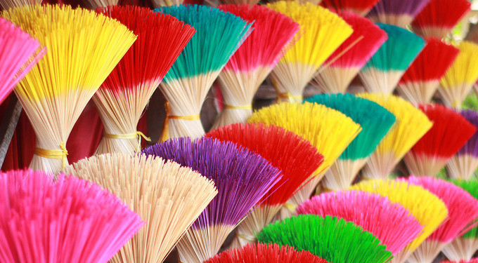 Раньше ароматные палочки имели только два цвета: коричневая смесь и красная сердцевина. Благовония для продажи сушат равномерно на солнце, чтобы быстро высохнуть.