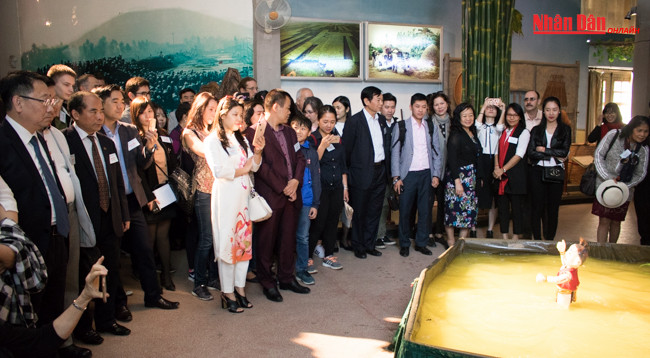 Делегаты смотрят театр кукол на воде в музее культур вьетнамских народностей. Фото: Тхань Тхе