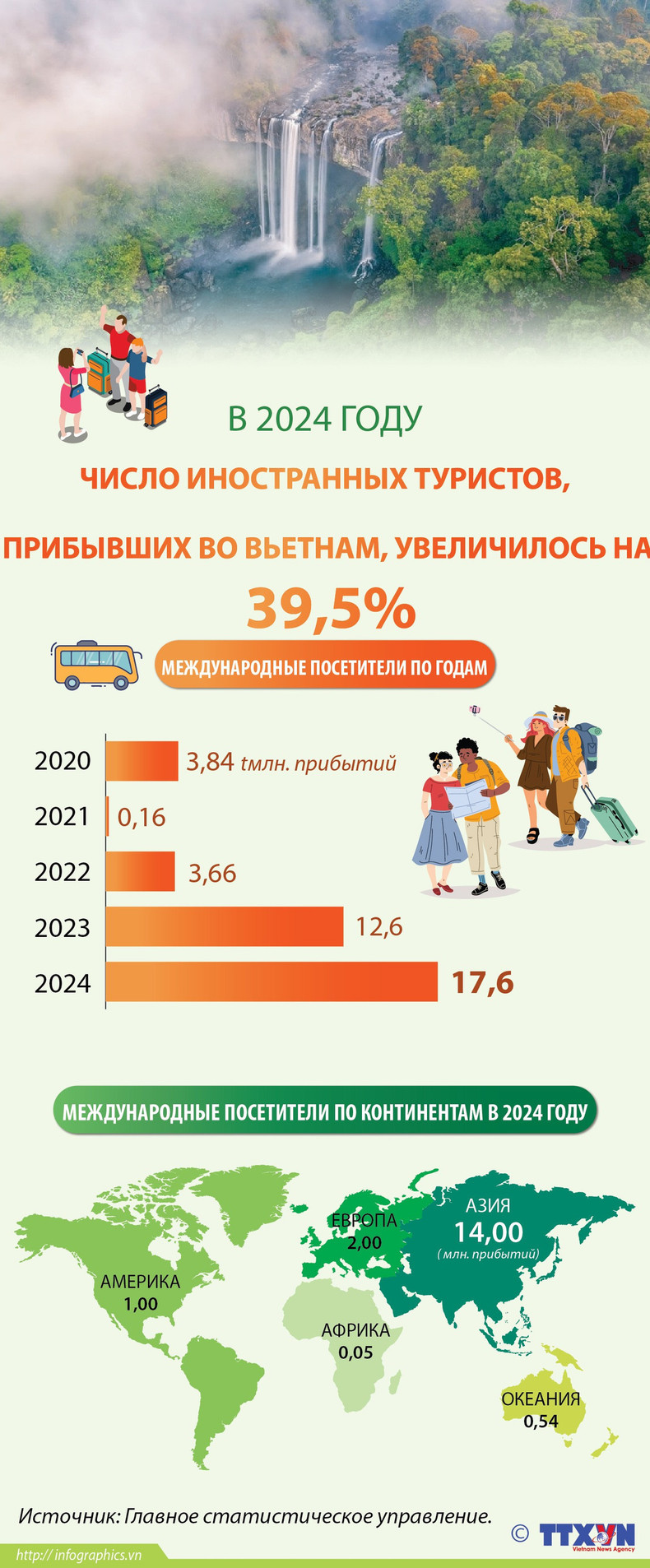 В 2024 году Вьетнам принял около 17,6 миллиона иностранных туристов, что на 39,5 % больше, чем в предыдущем году. Эта цифра эквивалентна 97,6% от общего числа в 2019 году, до пандемии COVID-19.