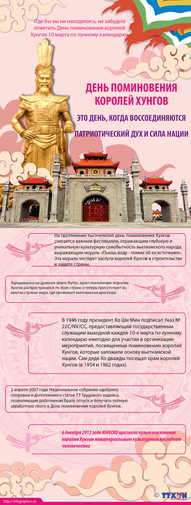 День поминовения королей Хунгов и фестиваль храма королей Хунгов - одни из важных праздников вьетнамского народа. Культ поклонения королям хунгов не только стал культурной самобытностью вьетнамского сообщества, но и стал репрезентативным нематериальным культурным наследием человечества.