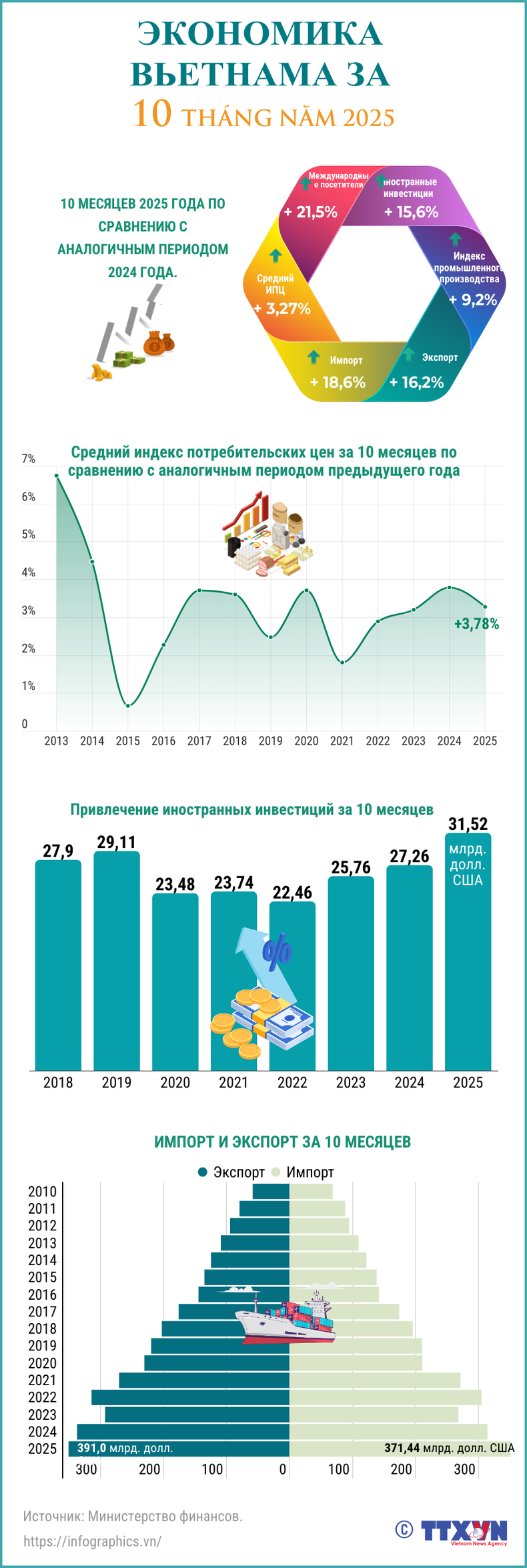 За 10 месяцев 2025 года общий объём вьетнамских инвестиций за рубеж достиг 1,1 млрд. долл. США, что в 2,3 раза больше по сравнению с аналогичным периодом 2024 года.