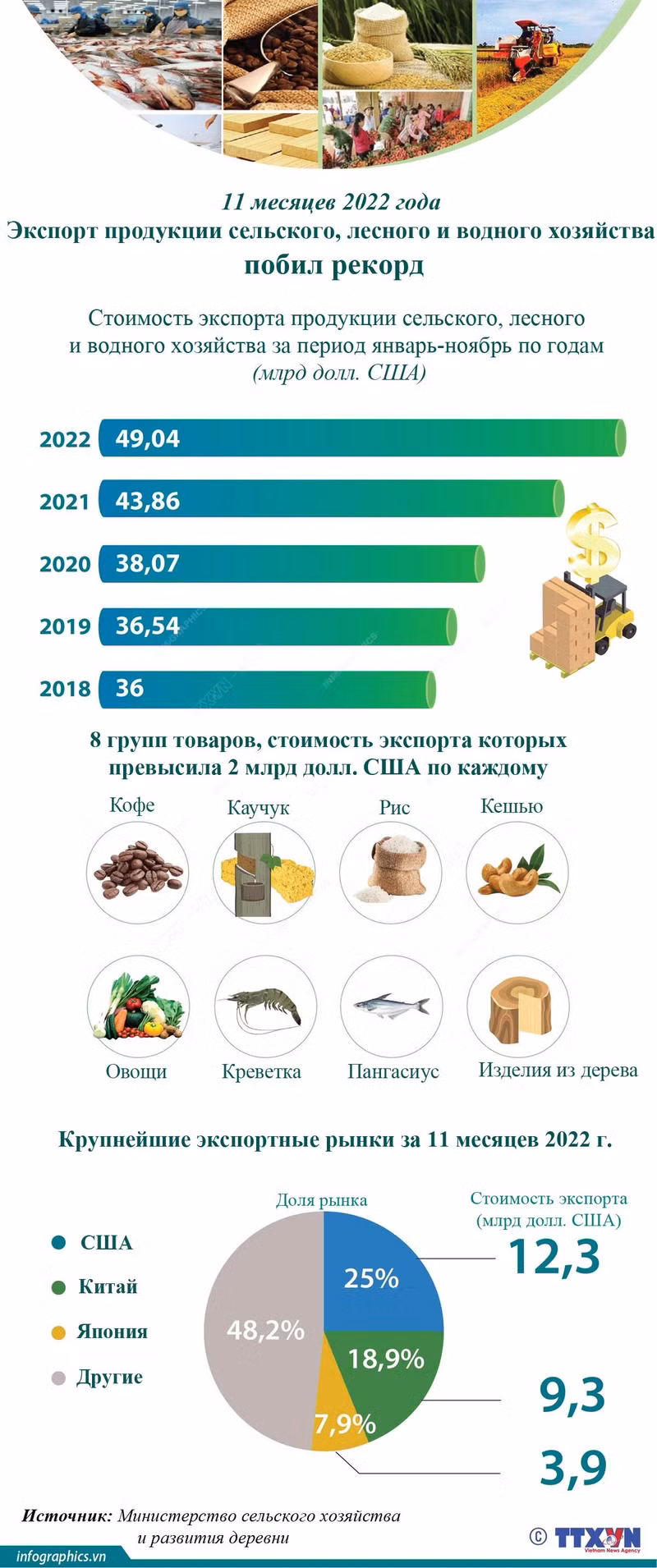За первые 11 месяцев 2022 г. стоимость экспорта продукции сельского, лесного и водного хозяйства достигла около 49,04 млрд долл. США, увеличившись на 11,8% по сравнению с тем же периодом прошлого года, превысив рекордный показатель в 48,6 млрд долл. США, установленный за весь 2021 год.