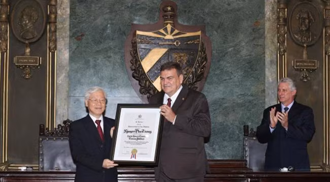 Гаванский университет организовал торжественную церемонию вручения диплома Почетного доктора политических наук Генеральному секретарю ЦК КПВ Нгуен Фу Чонгу за его важный вклад в дело строительства и развития Вьетнама, а также за обмен теоретическими знаниями и практическим опытом с Кубой.