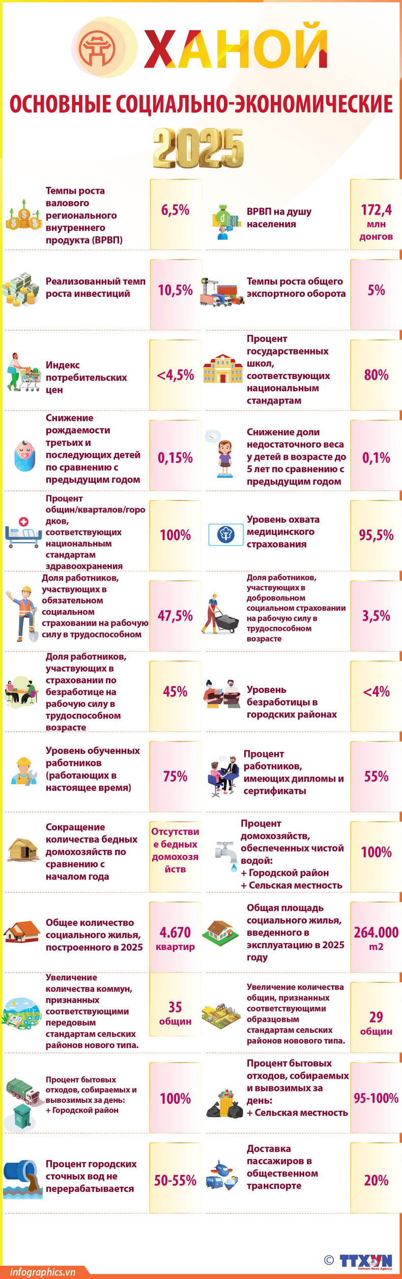 Согласно Резолюции о плане социально-экономического развития г. Ханоя на 2025 г., город стремится достичь темпов роста валового регионального внутренннего продукта (ВРВП) на 6,5% или выше. ВРВП на душу населения должен составить не менее 172,4 млн донгов. Кроме того, ожидается, что инвестиционный капитал вырастет не менее чем на 10,5 %, экспортный оборот – на 5 % и более, а индекс потребительских цен не превысит 4,5 %. К концу 2025 г. Ханой также намерен полностью ликвидировать бедность.