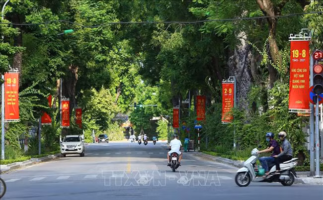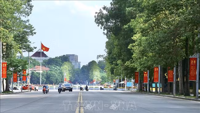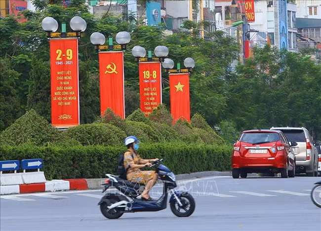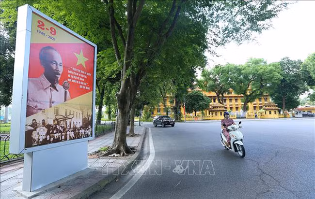 Панно большого размера в честь Дня независимости Вьетнама 2 сентября висит на перекрестке Отьозыа (район Донгда).