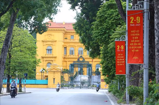 Афиши в честь Дня независимости Вьетнама 2 сентября размещены перед Президентской резиденцией.