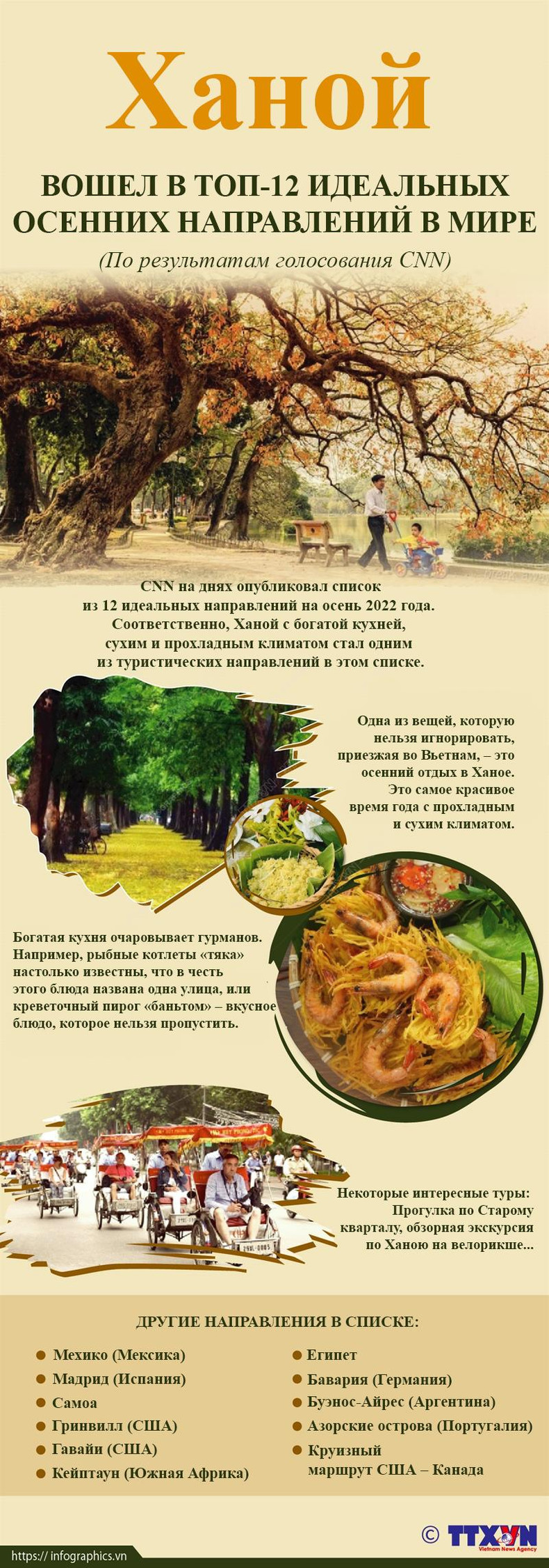 CNN на днях опубликовал список из 12 идеальных направлений на осень 2022 года. Соответственно, Ханой с богатой кухней, сухим и прохладным климатом стал одним из туристических направлений в этом списке.