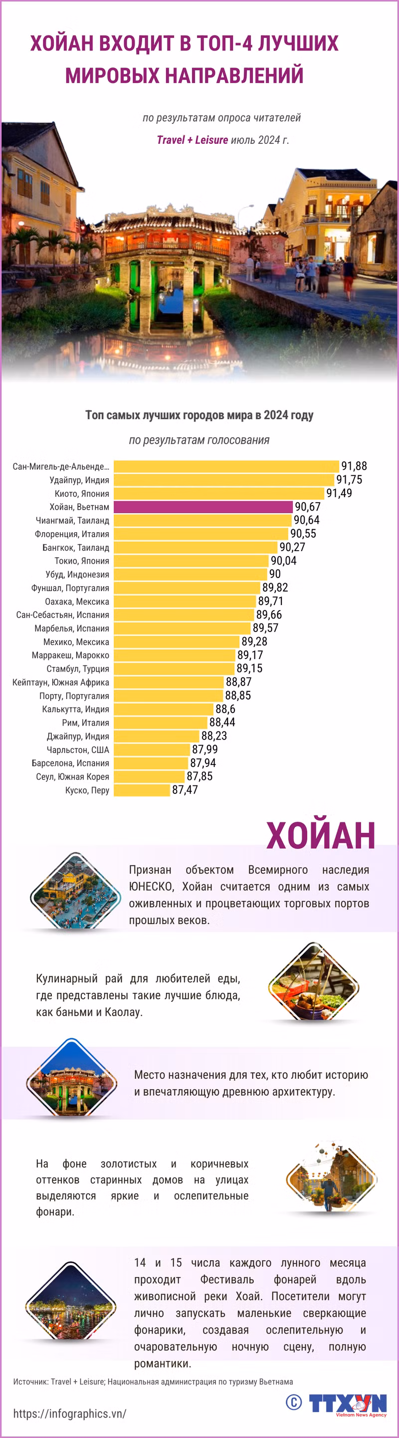 В рейтинге World's Best Awards 2024 известного туристического журнала Travel+Leisure читатели проголосовали за 25 самых популярных городов мира, и Хойан занял четвертое место, набрав 90,67 балла.