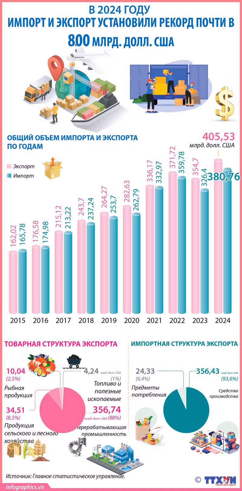 общий объем импорта и экспорта товаров достиг 786,29 млрд долл. США, увеличившись по сравнению с 2023 годом на 15,4%, в том числе экспорт увеличится на 14,3%, импорт – на 16,7%. Сальдо торгового баланса товаров положительное 24,77 млрд долл. США.