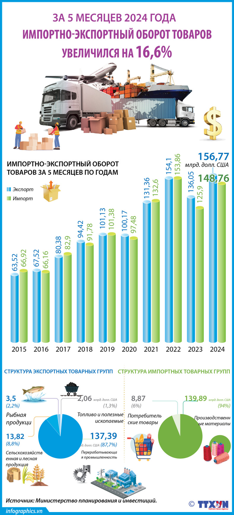 За первые 5 месяцев 2024 года общий импортно-экспортный оборот товаров достиг 305,53 млрд долл. США, увеличившись на 16,6% по сравнению с аналогичным периодом 2023 года.