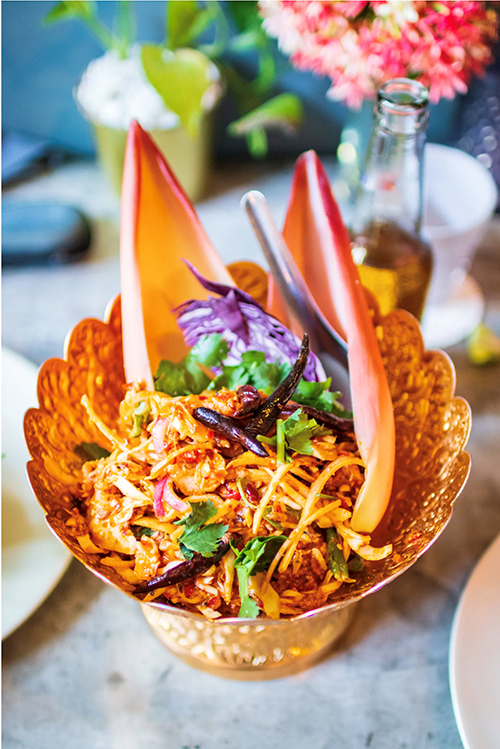 Нарезанная соломкой зеленая папайя придает салату хруст и пикантный вкус, а сочные спелые манго придают незабываемый сладкий вкус. Блюдо обычно украшают различными травами, такими как кориандр и мята, и сбрызгивают соком лайма.