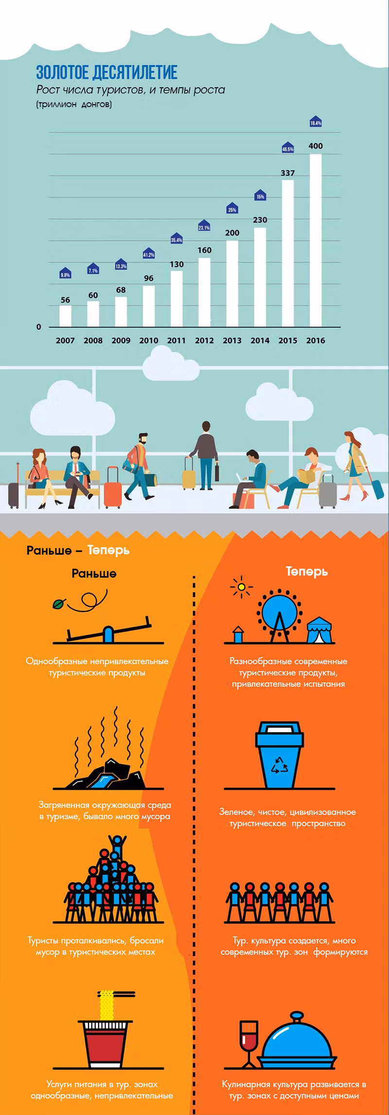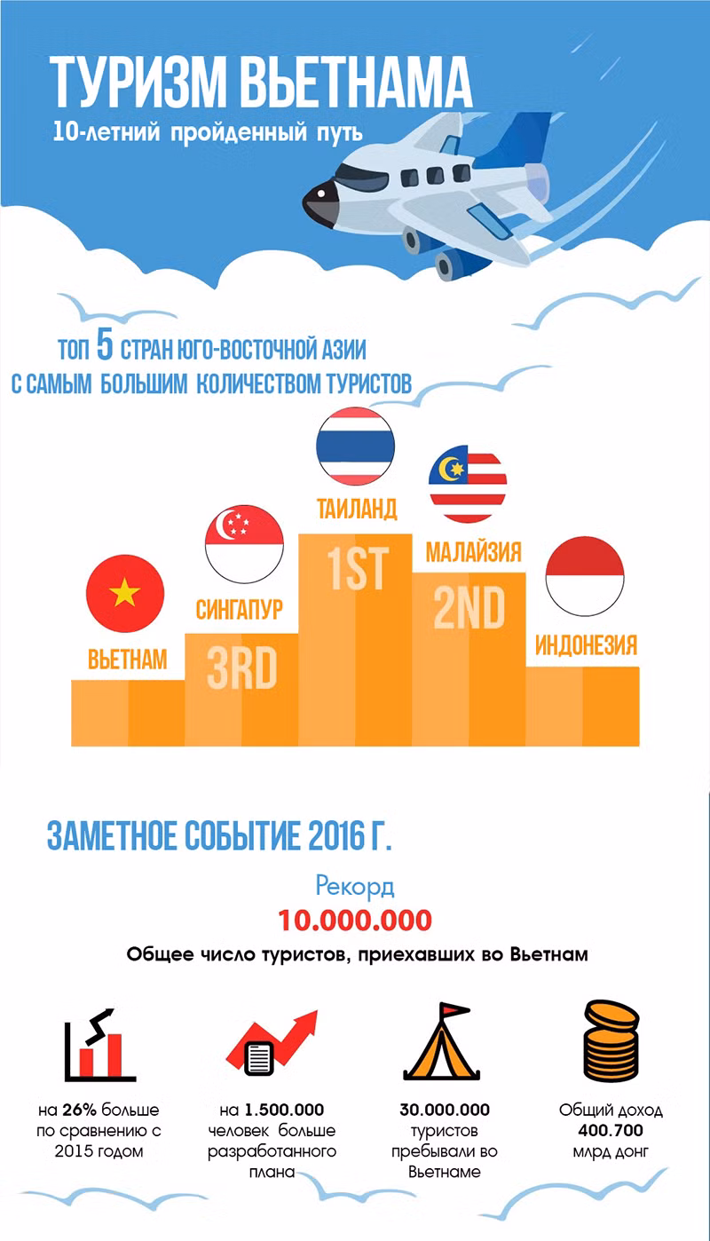 Количество туристов необычайно быстро выросло, много курортов один за другим вошли в Топы, выбранные международными организациями, много туристических сооружений были построены. Всё это помогает Вьетнаму занять достойное место на туристической карте мира.