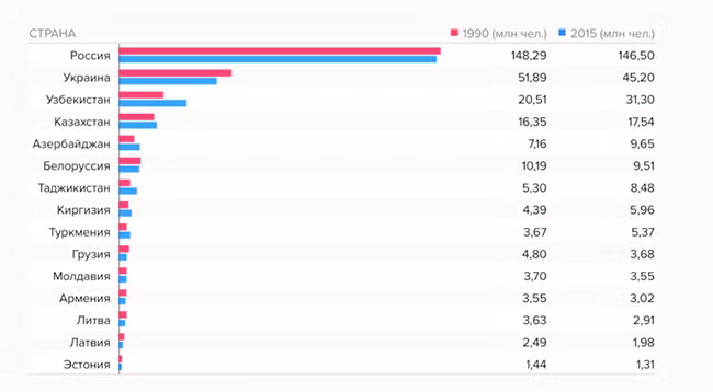Владислав Иноземцев: Если не брать Прибалтику, которая воспользовалась возможностями ЕС, то основной водораздел проходит между странами, которые добывают природные ресурсы, и теми, у кого таких ресурсов нет. Если ресурсы есть, то и рост более-менее заметен. Выбивается из этого ряда Белоруссия, где во многом сохранилась советская система хозяйствования, но у ряда экспертов достоверность и адекватность статистических данных из Белоруссии вызывает сомнения. По сути же развал Союза повторяет ситуацию распада любой колониальной империи, когда часть южной периферии проваливается в развитии из-за разрыва хозяйственных связей.
