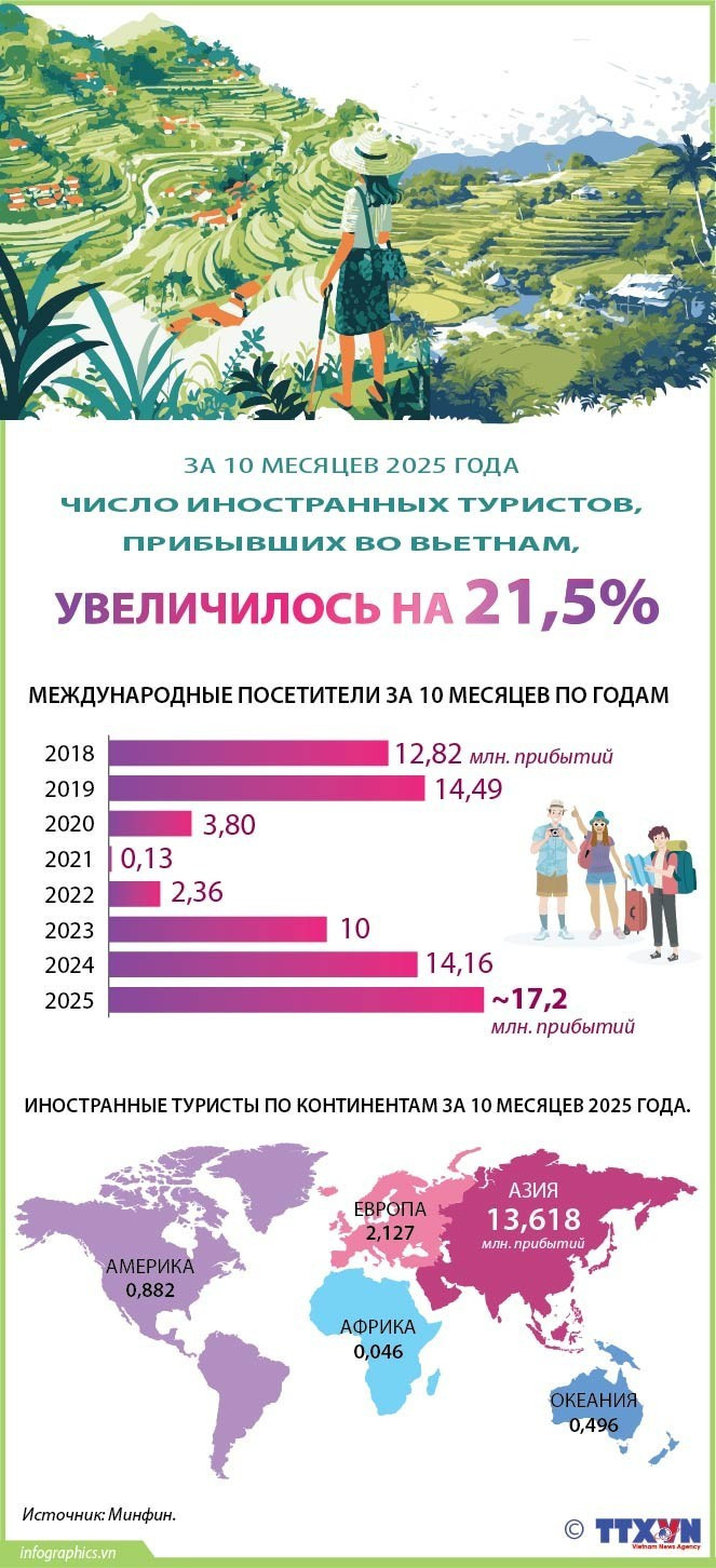 Количество иностранных туристов, посетивших Вьетнам в период с января по октябрь, достигло почти 17,2 миллиона человек, что на 21,5% больше по сравнению с аналогичным периодом прошлого года, свидетельствуя о сильной динамике роста накануне пикового туристического сезона в конце года. Об этом сообщила Национальная администрация по туризму Вьетнама.