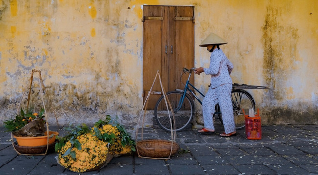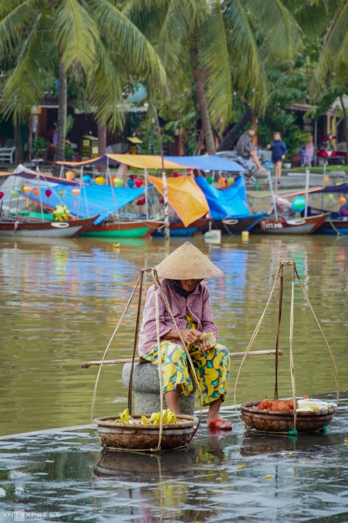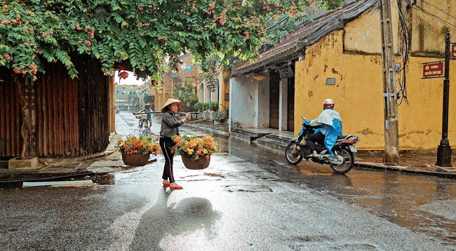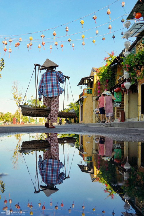 Лужа после дождя, на которой отражается женщина, несущая коромысла с корзинами бананов. Независимо от капризной погоды, всегда можно встречать женщин, несущих на плечах коромысла с продуктами на улицах Хойана. Это зрелище стало неотъемлемой частью местной жизни.