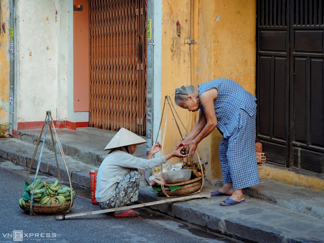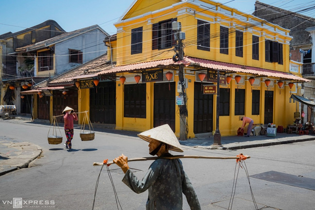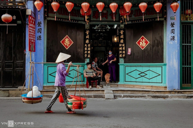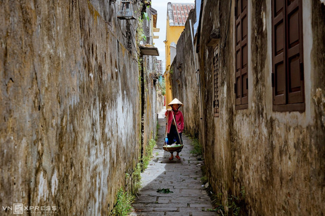 Поэтическая картина вьетнамской женщины с коромыслом на улице Нгуентхайхок. Испытывая много взлетов и падений, коромысло c корзинами продуктов стало частичкой древних улиц Хойана.