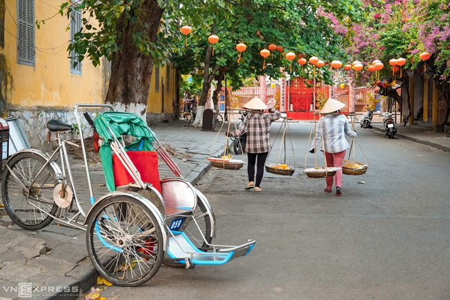 Женщины с коромыслом на плечах проходят мимо велорикши на улице Тяутхыонгван. Это средство транспорта предпочитают многие туристы во время экскурсии по городу.