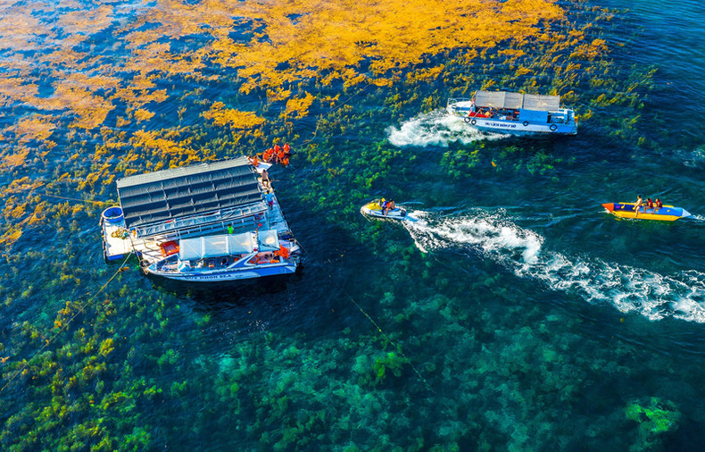 Лодки обслуживают туристов на море вокруг острова Хонкхо, Ньонхай. Здесь туристы могут погрузиться, чтобы понаблюдать за кораллами, арендовать плавучие буи, гидроцикл и поесть морепродукты прямо на плоту.