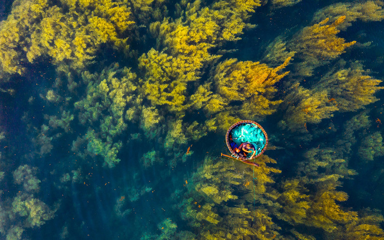 Рыбаки плывут на лодке в виде корзины, чтобы ловить рыбу в море Ньонхай, внизу – бурые водоросли.
