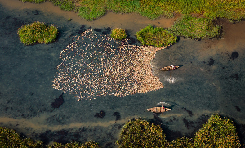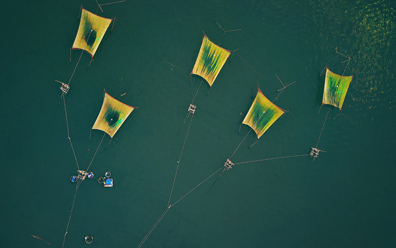 Рыбаки ловят рыбу с помощью рыболовных сетей в уголке лагуны Тхинай. Это большая лагуна с морской водой площадью более 5000 га, расположенная на юго-востоке провинции Биньдинь.