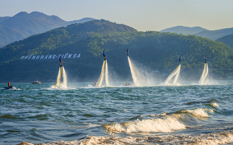 Впечатляющая акробатика игроков флайборда во время выступления в апреле 2019 года в Гэньранг – Тиенса. Здесь расположены известные туристические направления, такие как Байчынг, пляж Тиенса и гробница известного поэта Хан Мак Ты.