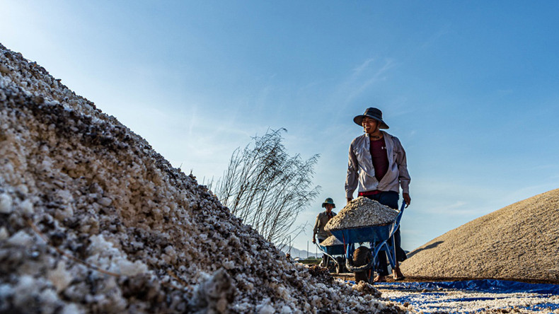 Под палящим солнцем крестьяне усердно собирают соль.