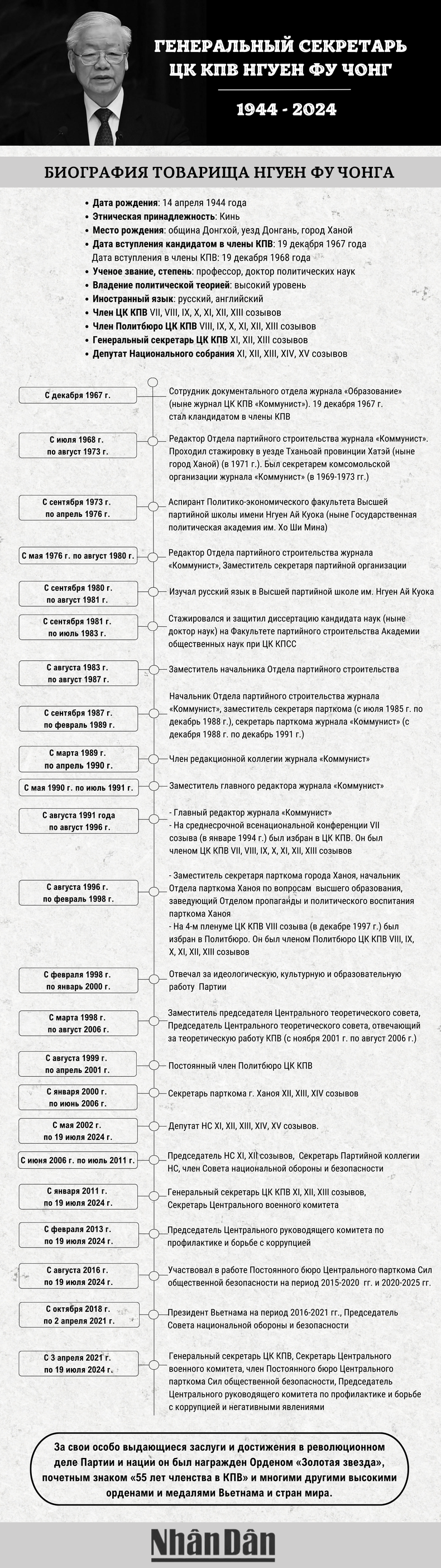 По информации Профессионального совета по охране здоровья сотрудников центральных органов, товарищ Генеральный секретарь ЦК КПВ Нгуен Фу Чонг после болезни, несмотря на то, что Партия, Государство, ведущие профессора и врачи, эксперты приложили все возможные усилия, чтобы спасти ему жизнь, несмотря на искреннюю заботу семьи, из-за преклонного возраста и вследствие тяжелой болезни, скончался в 13 часов 38 минут 19 июля 2024 года в Центральном военном госпитале №108 на 80-м году жизни.