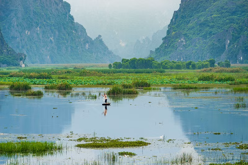 Лагуна Ванлонг известна как «Бухта Халонг без волны» в провинции Нинбинь. Плывя на лодке по лагуне, нам удается любоваться спокойной поверхностью воды, как гигантским зеркалом, отражающим глыбы известняковых гор в различных формах.