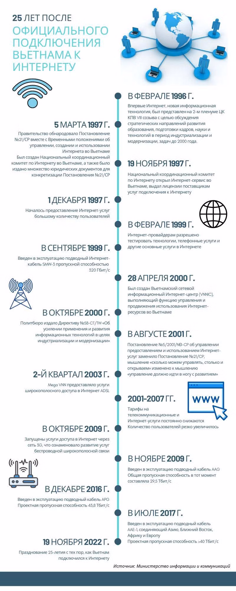 В течение 25 лет после подключения к Интернету (19 ноября 1997 г. – 19 ноября 2022 г.) Интернет Вьетнама сильно развивался. Уровень использования Интернета достигает более 70% населения. Интернет стал насущной потребностью всех людей, основой для развития цифровой экономики и цифрового общества во Вьетнаме.