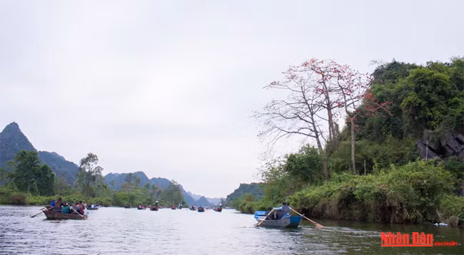 В это время, сидя на лодках, туристы имеют возможность полюбоваться такими цветками, которые расцветают на берегу речки Йен. Фото: Хонг Линь