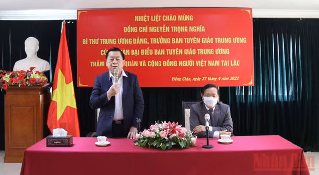 На беседе с должностными лицами и сотрудниками Посольства Вьетнама в Лаосе, учреждений при Посольстве и представителями вьетнамской диаспоры в Лаосе товарищ Нгуен Чонг Нгиа выразил желание, чтобы должностные лица и сотрудники Посольства, представительств и вьетнамская диаспора в Лаосе продолжали служить мостом для развития сотрудничества между двумя странами, продолжали развивать традиции патриотизма и солидарности, помогать друг другу в жизни, строго соблюдать законы страны пребывания, а также всегда обращались к Родине.