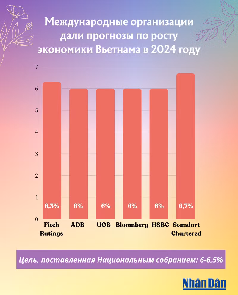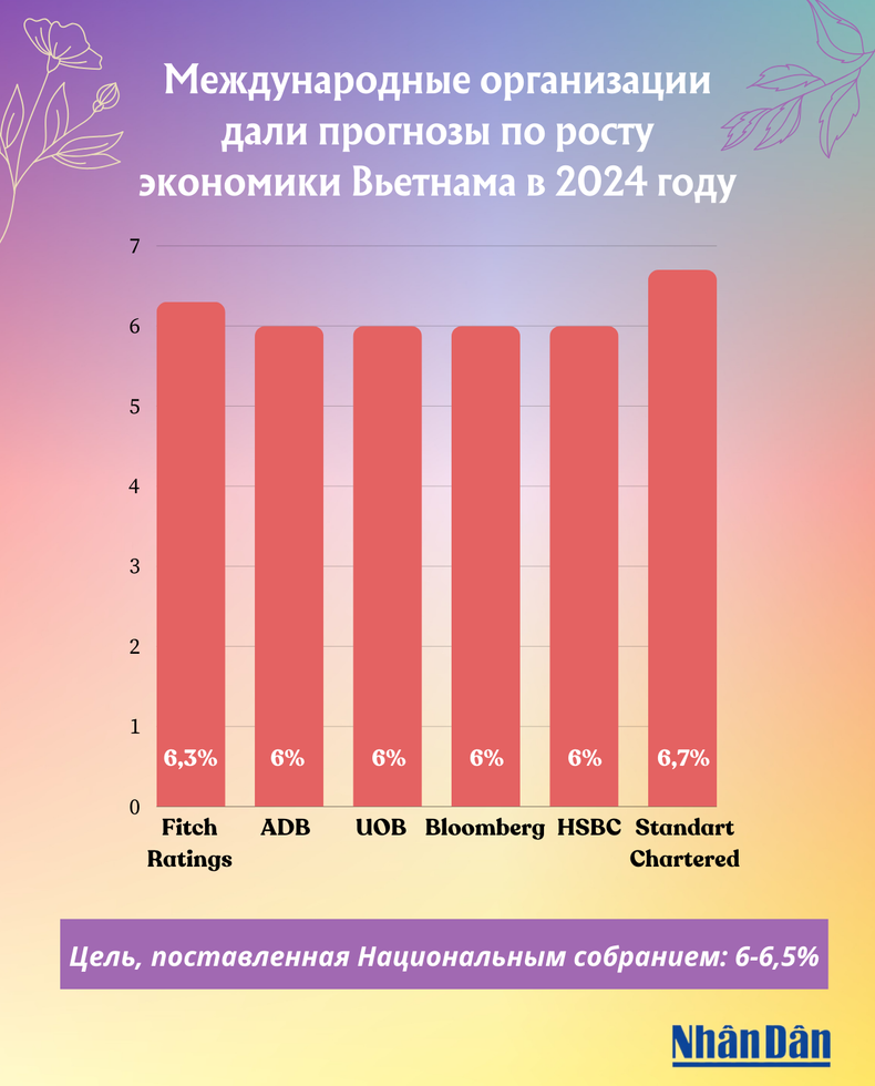 По прогнозам Азиатского банка развития (АБР), Bloomberg и HSBC, рост ВВП Вьетнама в 2024 году может достичь 6%. Между тем, банк Standard Chartered прогнозирует рост на уровне 6,7%, что превышает целевой показатель, поставленный Национальным собранием Вьетнама (6-6,5%).