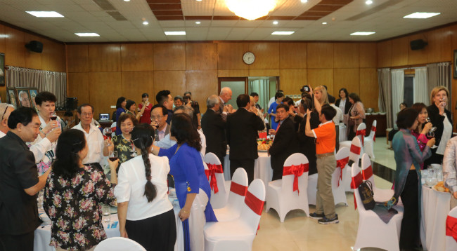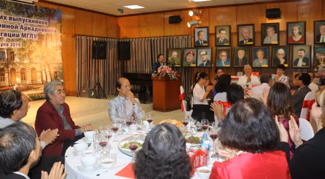 Вьетнамские выпускники МГЛУ поднимают тост и поздравляют друг друга на встрече. Фото: Нгуен Хоанг