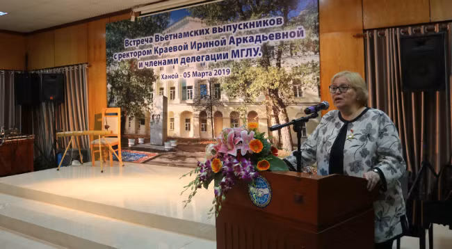 Выступая на встрече, г-жа Ирина Краева сказала, что она и члены делегации МГЛУ были рады присутствовать на этой теплой встрече, и выразила свою глубокую благодарность вьетнамским выпускникам. «МГЛУ всегда гордится тем, что стал местом подготовки отличных вьетнамских студентов», – с радостью сказала г-жа Краева. Она сообщила, что в 2020 году МГЛУ будет отмечать 90-летие со дня своего основания и надеется, что университет будет приветствовать представителей многих поколений вьетнамских студентов.