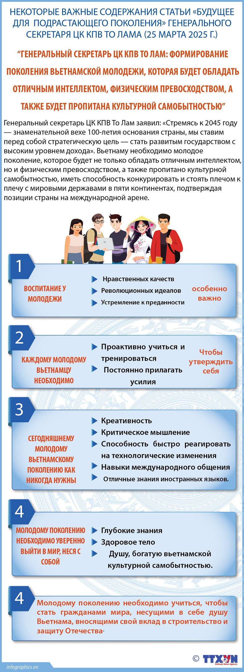 Вьетнаму необходимо молодое поколение, которое будет не только обладать отличным интеллектом, но и физическим превосходством, а также пропитано культурной самобытностью, иметь способность конкурировать и стоять плечом к плечу с мировыми державами в пяти континентах, подтверждая позиции страны на международной арене.