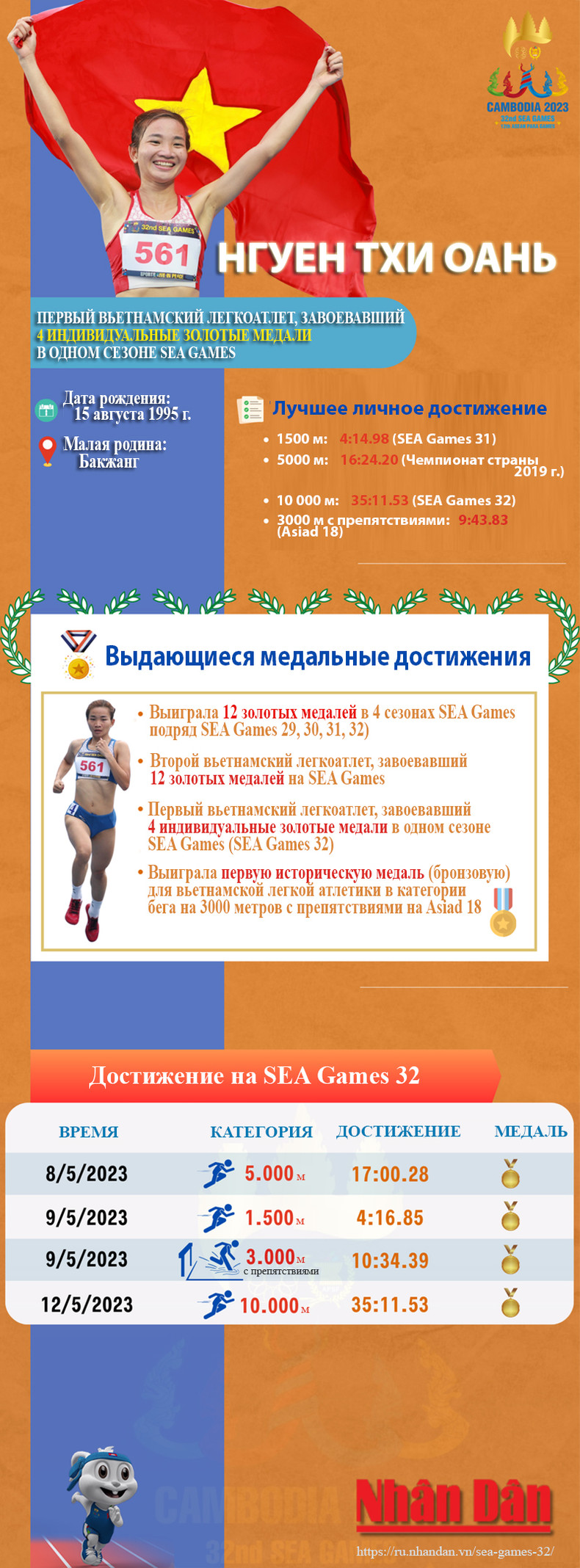 Являясь одной из спортсменов, принесших наибольшее количество золотых медалей вьетнамской спортивной делегации на 32-х Играх Юго-Восточной Азии (SEA Games 32), Нгуен Тхи Оань вошла в историю как первый вьетнамский легкоатлет, завоевавший 4 индивидуальные золотые медали в одном сезоне SEA Games.