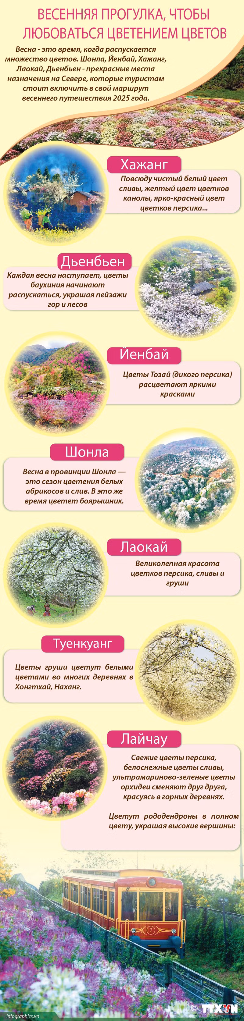 Весна – это время, когда распускается множество цветов. Шонла, Йенбай, Хажанг, Лаокай, Дьенбьен  – прекрасные места назначения на Севере, которые туристам стоит включить в свой маршрут весеннего путешествия 2025 года.
