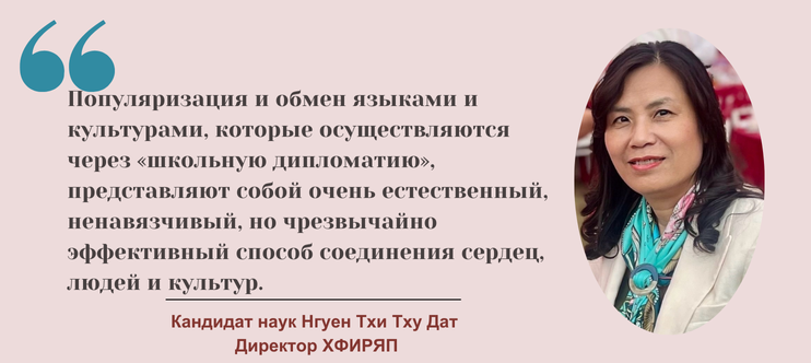 «Через мероприятия, которые филиал организовывает на протяжении многих лет, мы осознаем, что популяризация и обмен языками и культурами, которые осуществляются через «школьную дипломатию», представляют собой очень естественный, ненавязчивый, но чрезвычайно эффективный способ соединения сердец, людей и культур. Дружба, которая зарождается в сердцах молодежи, будет расти с годами и станет прочной основой для дружбы и сотрудничества в будущем», - поделилась своим мнением госпожа Нгуен Тхи Тху Дат.