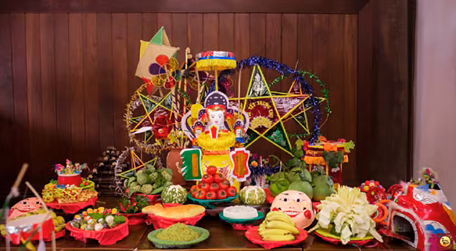 Согласно вьетнамским обычаям, к Празднику середины осени взрослые обычно сами делают детям или покупают им осенние игрушки, такие как фонари в форме звезды или карпа со свечами внутри, маски из папье-маше, барабаны ... По этому случаю повсюду люди исполняют танец цилиня (танец льва) под звуки барабанов, чтобы создать оживленную праздничную асмосферу.