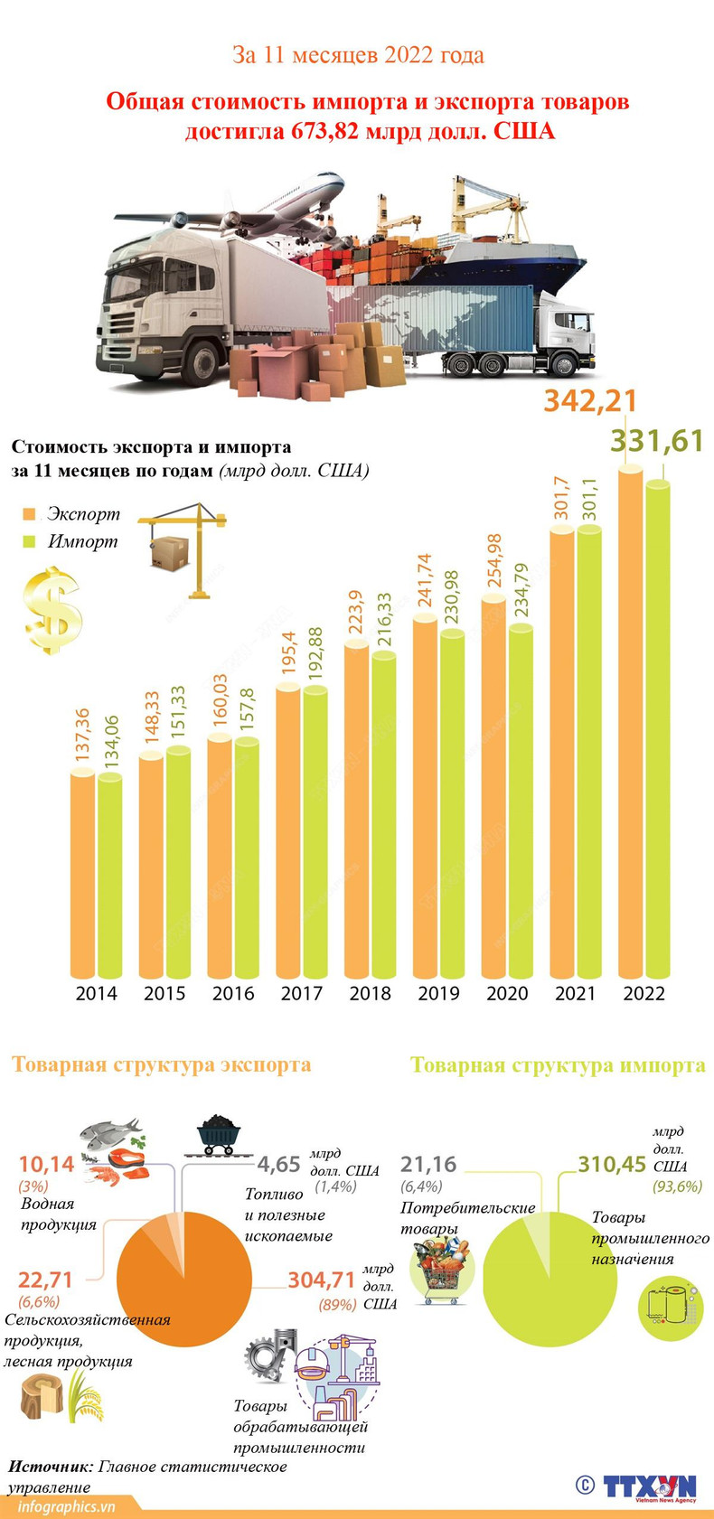За 11 месяцев 2022 г. общая стоимость импорта и экспорта товаров достигла 673,82 млрд долларов США, что на 11,8% больше, чем за аналогичный период 2021 года. Положительное сальдо торгового баланса составило 10,6 млрд долларов США.