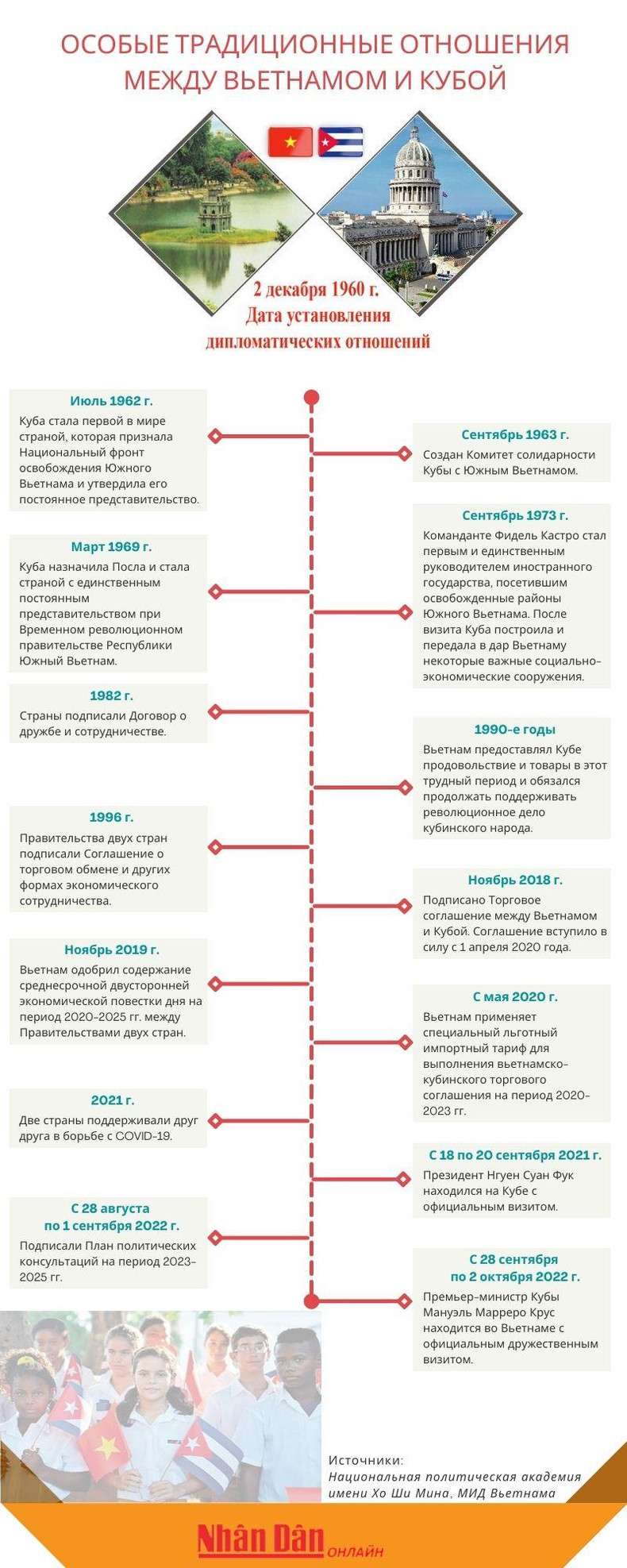 Отношения солидарности, верности, доверия и всеобъемлющего сотрудничества между Вьетнамом и Кубой постоянно укреплялись Президентом Хо Ши Мином, вождем Фиделем Кастро и поколениями руководителей и народами двух стран, стали ценным достоянием в деле защиты и строительства социализма в каждой стране, и эти отношения преодолели многие взлеты и падения в ходе истории за последние более 60 лет.