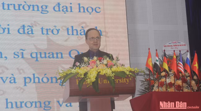 Проректор Ханойского университета, кандидат наук Лыонг Нгок Минь выступает с речью.
