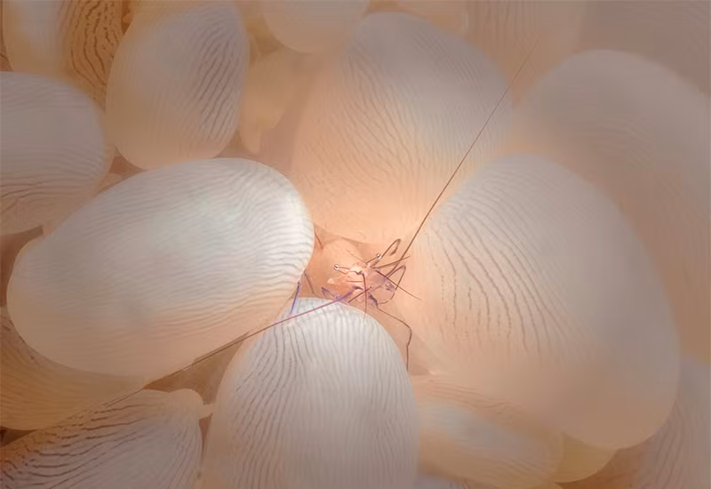 Маленькая креветка cреди пузырьковых кораллов в форме яиц.