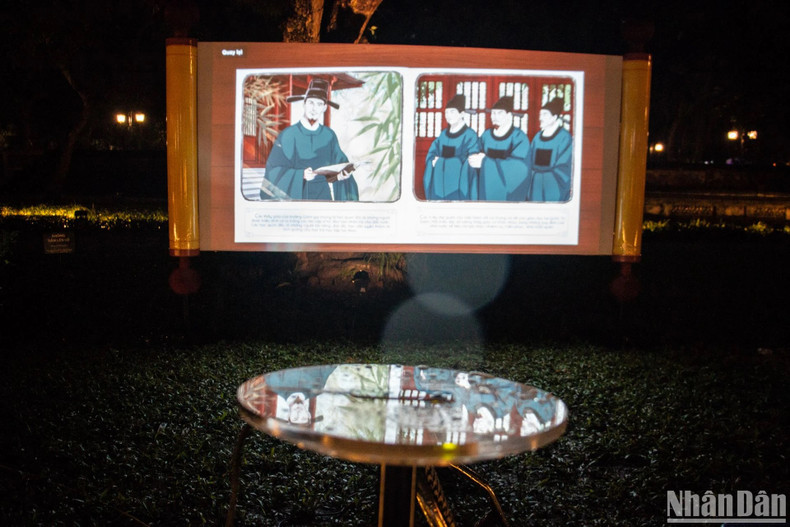 |   В завершение экскурсии посетителям удается посмотреть 3D-презентацию на тему «Квинтэссенция научной школы». Это изюминка ночной экскурсии по Храму литературы «Ванмиеу – Куоктыжам». Весь фасад переднего дома во дворе Тхайхок превращается в гигантский экран, одну за другой проецирующий полезную информацию, что помогает посетителям открыть для себя наиболее существенные ценности вьетнамской научной школы.  |