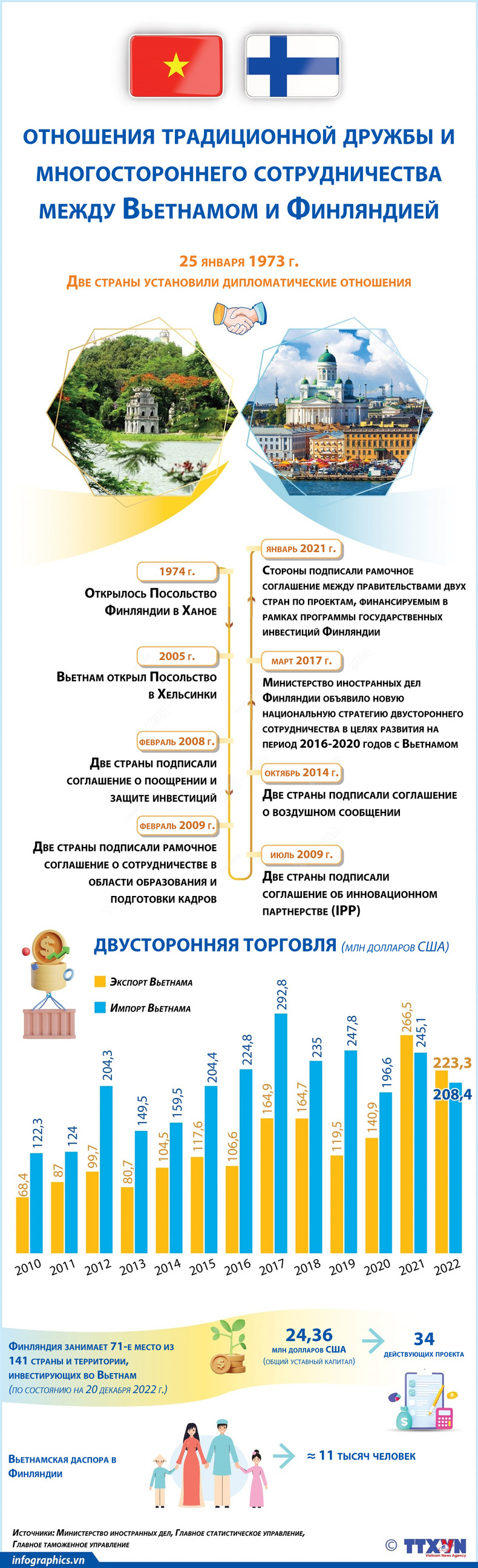Вьетнам и Финляндия установили дипломатические отношения 25 января 1973 года. На протяжении последних 50 лет отношения традиционной дружбы и многостороннего сотрудничества между Вьетнамом и Финляндией активно развивались.
